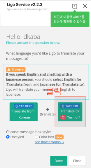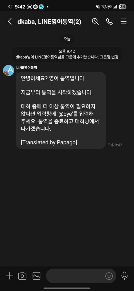 넘편합니다. 그리고 대화도중 통역이 필요없다면 채팅창에 @bye를 입력하면 통역이 종료됩니다.