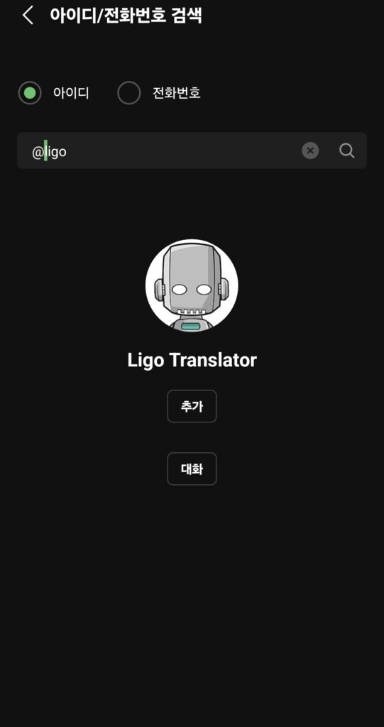 공식친구는 없었지만 그런경우 친구 찾기로 @ligo를 검색하시면 아래와 같이 로봇같이 생긴 친구가 나오는데 일단 친구추가해줍니다.