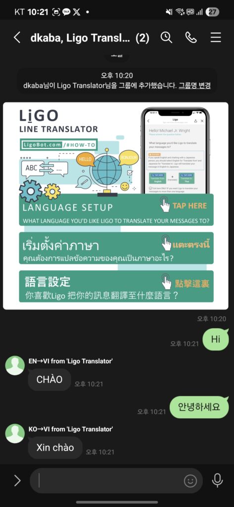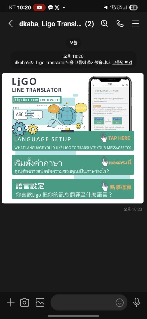 Ligo자동번역봇 초대 – 기타 다른 언어 번역 필요한 경우(태국, 필리핀, 스페인어)