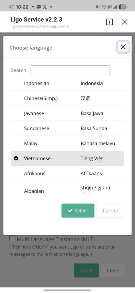 베트남어를 위와같이 선택해줍니다.(Vietnamese)로 잘 선택하고 Select버튼을 클릭해주면 끝입니다.